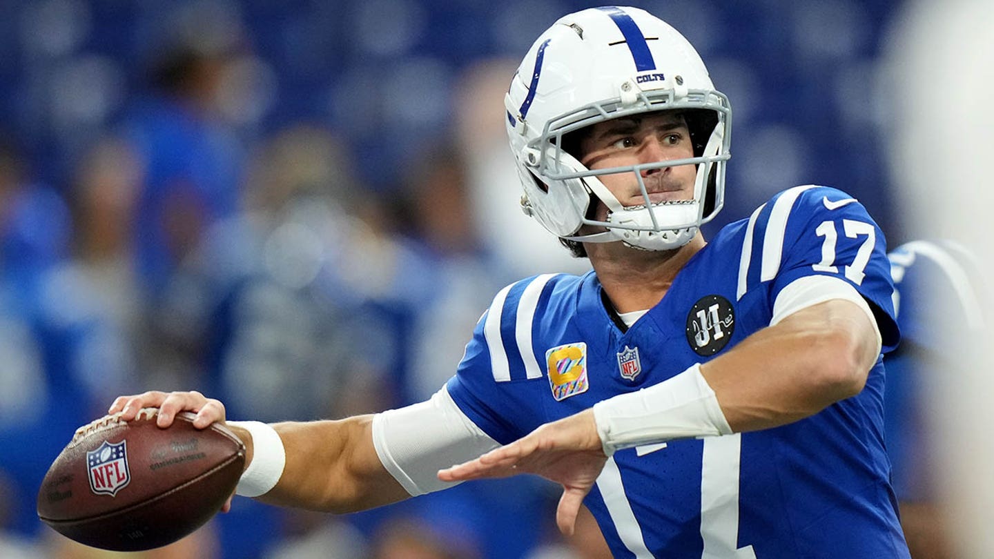 Rozohrávač Indianapolis Colts Daniel Jones hádže pred futbalovým zápasom NFL proti Las Vegas Raiders v Indianapolise, Indiana, 5. októbra 2025. (AJ Mast/AP Photo)