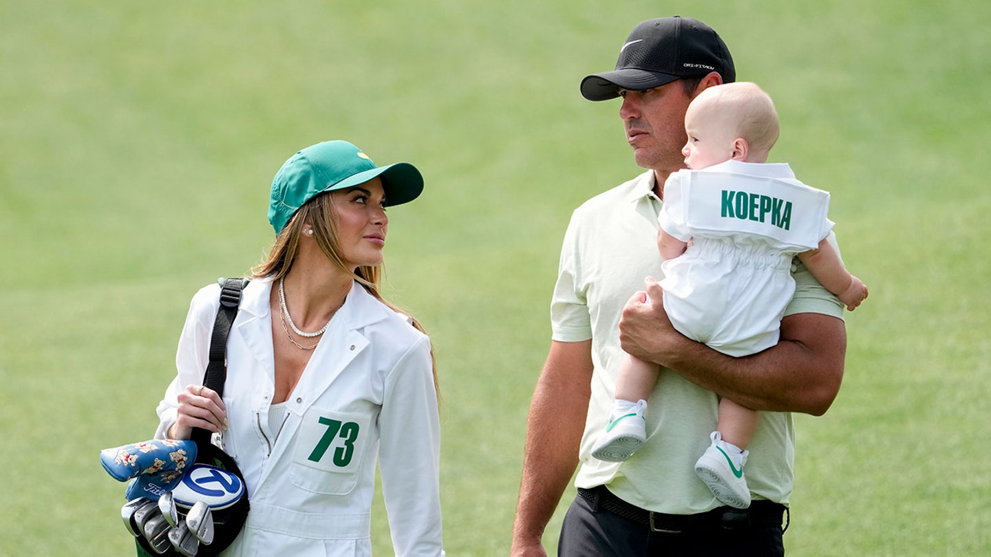 Brooks Koepka prináša svoje dieťa, tím, zatiaľ čo prechádza v blízkosti životného prostredia č. 4 so svojou lepšou polovicou Jena Sims, v celej súťaži Par 3 v Auguste National Golf Club 10. apríla 2024. (Michael Madrid/USA Today Network)