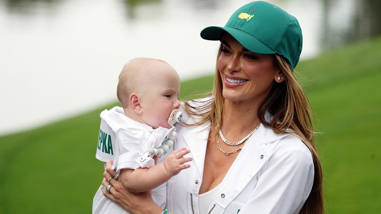 Lepšia polovica Jena Sims spoločnosti Brooks Koepka privádza svoj detský tím po celej súťaži Par 3 v súťaži Par 3 v Auguste National Golf Club 10. apríla 2024. (Kyle Terada/USA Today Network)