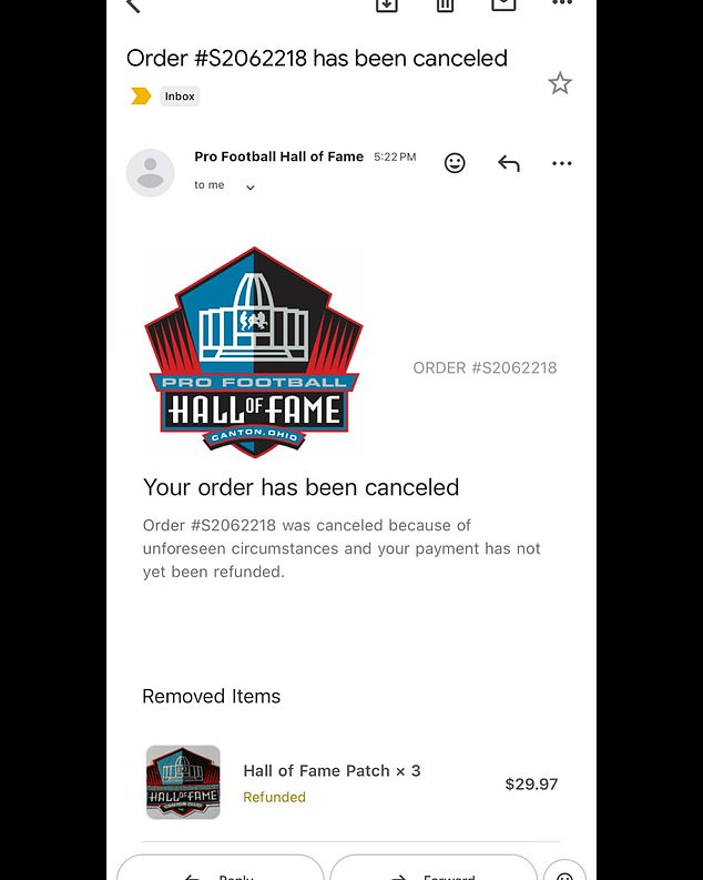 Hudson zverejnil snímku obrazovky e-mailu s popisom: ‚Hej @profootballhof, aké boli „nepredvídané okolnosti“?‘ so smejúcim sa emotikonom.