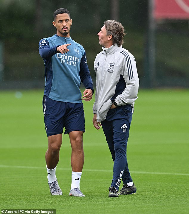 Gabriel Heinze a William Saliba (vľavo) hovoria o ochranných metódach na tréningu Arsenalu