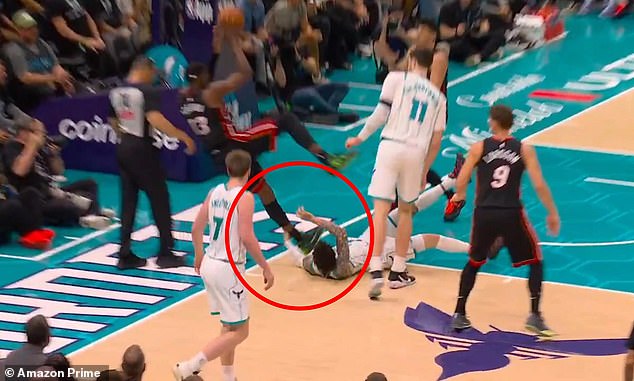 Lopta stroskotala pri nohách Adebaya asi dve minúty pred druhou štvrtinou. Keď sa Adebayo snaží získať späť rovnováhu na jednej nohe, Ball sa naťahuje dozadu a chytá ho za členok