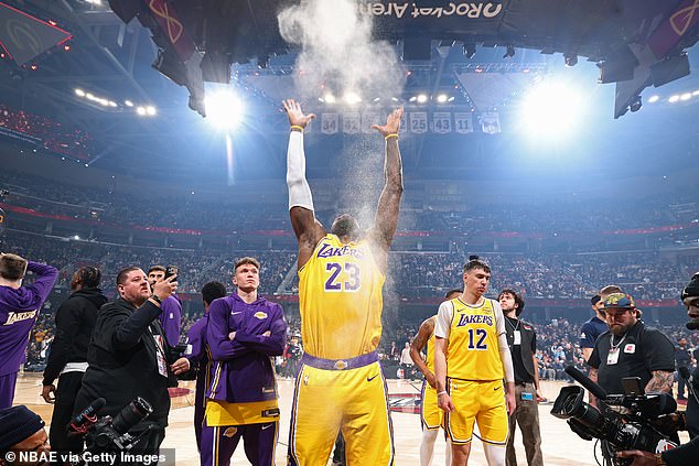 41-ročná hviezda Los Angeles Lakers urobila svoj zvyčajný „hádzanie kriedou“ predtým, ako vykročila na podlahu v Rocket Arene, aby sa stretla so svojím bývalým tímom.