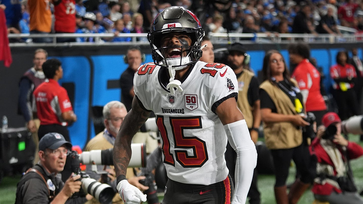 Tampa bay Bay Buccaneers prihrávka na prihrávku Tez Johnson (15) si pripomína gól proti Detroit Lions počas 2. päťdesiatich percent futbalovej videohry NFL v pondelok 20. októbra 2025 v Detroite. (AP Photo/Paul Sancya)