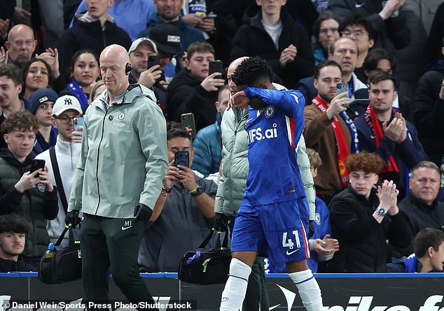 Tínedžerský krídelník sa zranil hneď na začiatku a v 16. minúte ho musel nahradiť bývalý hráč United Alejandro Garnacho, ktorého nemilosrdne týrali hostia počas porážky 1:0 na Stamford Bridge.