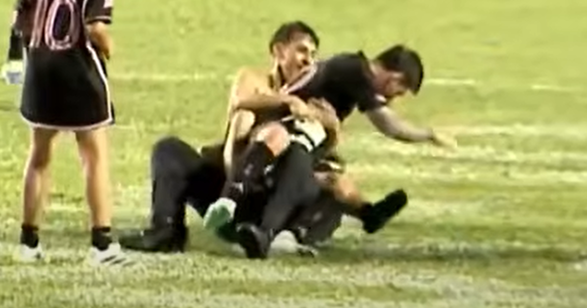 Ale útočník bez košele, ktorý už padol, ale vyhol sa zajatiu, potom bežal k bývalej hviezde Barcelony a Paris Saint-Germain a chytil sa ho. Člen ochranky, ktorý mal za úlohu vyčistiť ihrisko, muža zvalil na zem a stiahol so sebou aj Messiho.