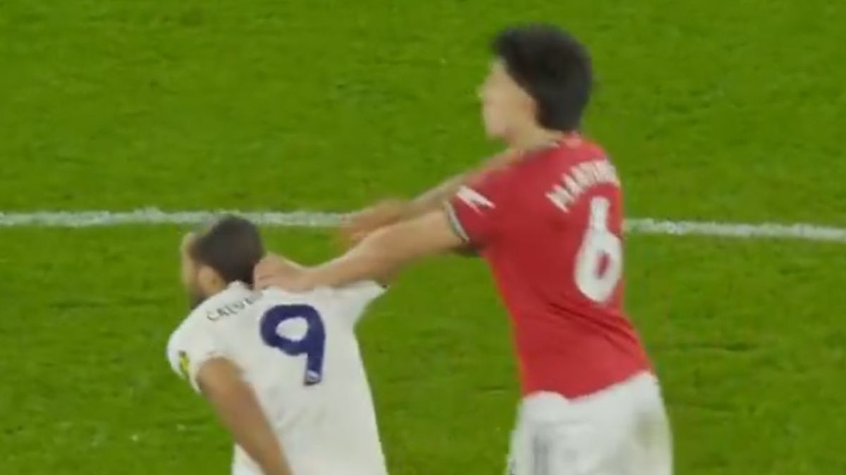 Lisandro Martinez bol vylúčený po preskúmaní VAR za ťahanie za vlasy Dominica Calverta-Lewina.