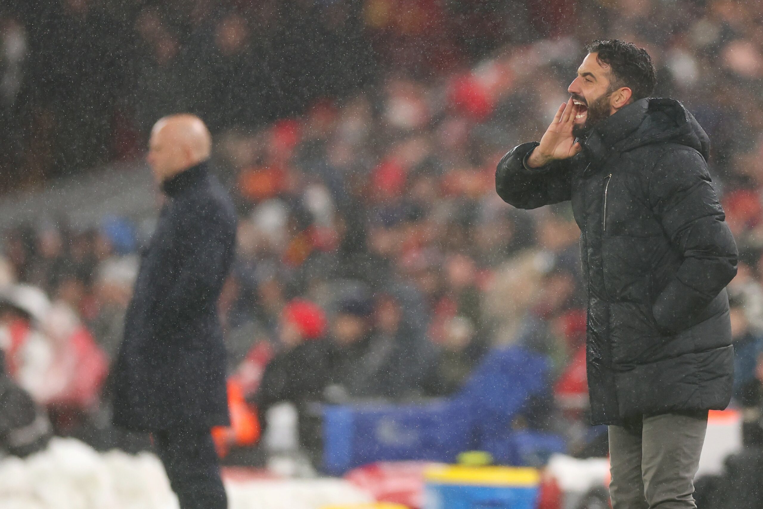 Ruben Amorim, manažér Manchestru United, reaguje počas zápasu Premier League v Liverpoole. (Foto: Carl Recine/Getty Images)