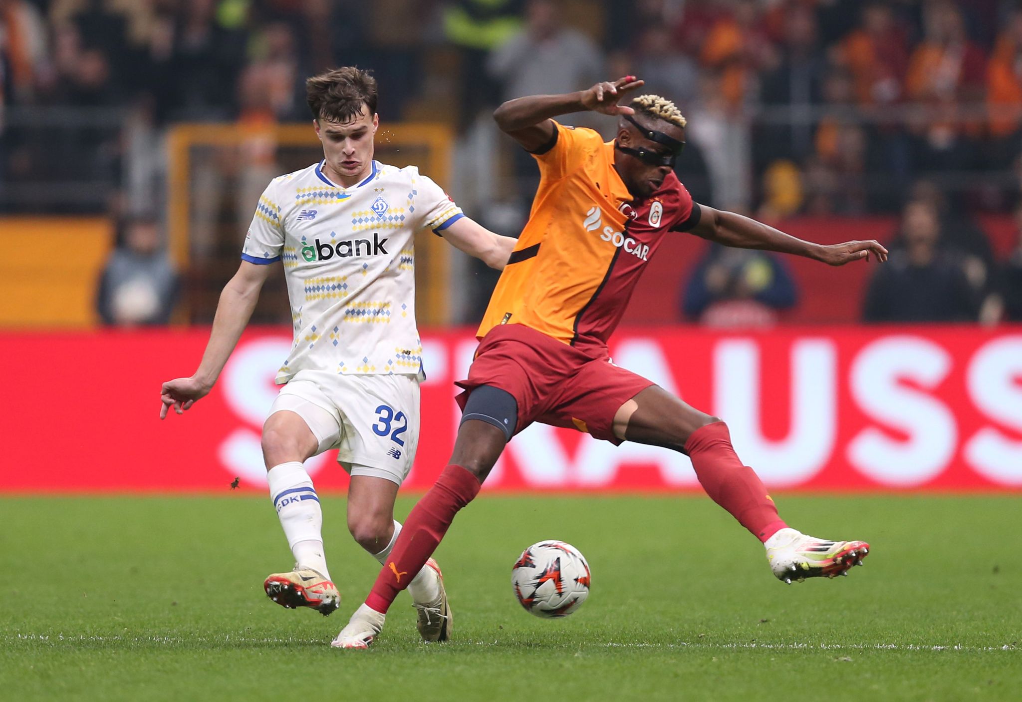 Victora Osimhena z Galatasaray testuje Taras Mykhavko z FC Eager Beaver Kyjev. (Obrázok od Ahmada Mora/Getty Images)