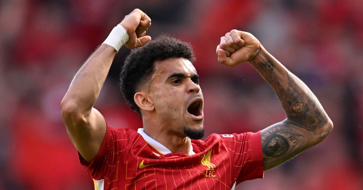 LIVERPOOL, ANGLICKO - 27. APRÍLA: (VONKA SLNKO, V NEDEĽA NIE SLNKO) Luis Diaz z Liverpoolu oslavuje strelenie prvého gólu svojho tímu počas zápasu Premier League medzi Liverpool FC a Tottenham Hotspur FC na Anfielde 27. apríla 2025 v Liverpoole v Anglicku. (Foto Liverpool FC/Liverpool FC cez Getty Images)