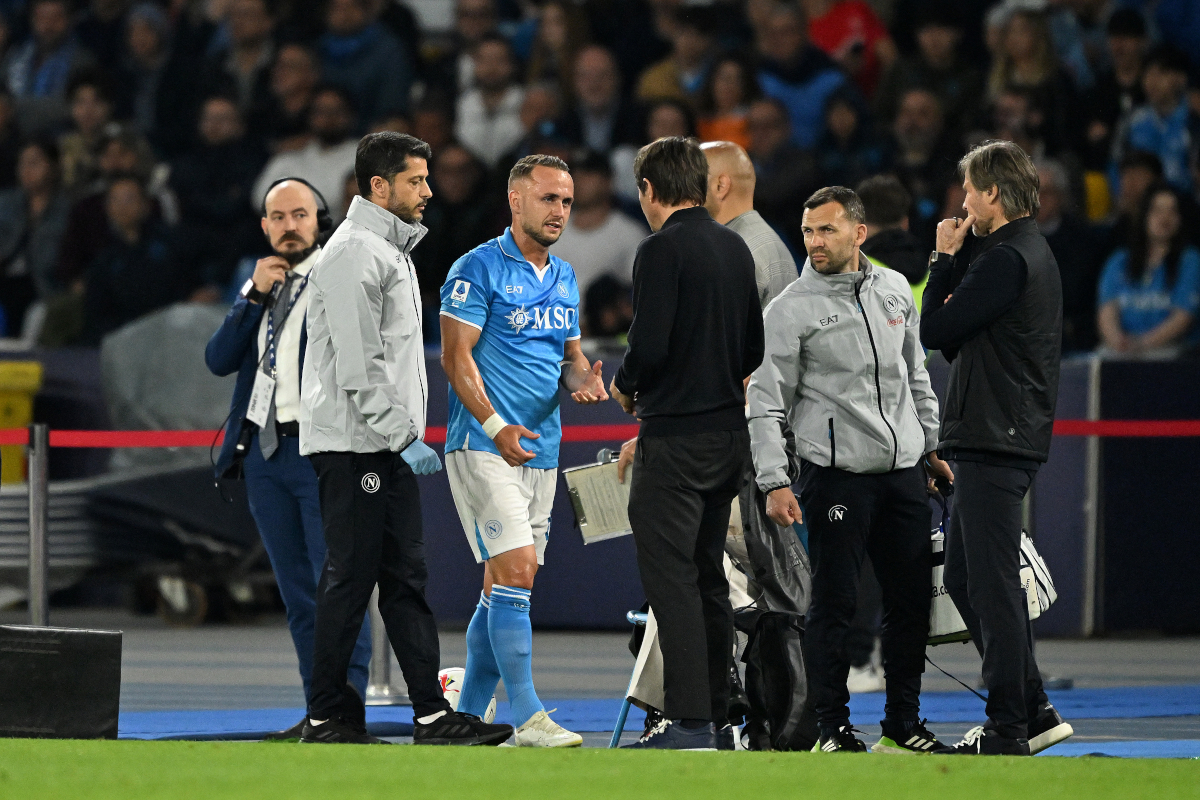 NEAPOL, TALIANSKO – 11. mája: Stanislav Lobotka z Neapolu sa zranil počas zápasu Serie A medzi Neapolom a Janovom na štadióne Diega Armanda Maradonu 11. mája 2025 v talianskom Neapole. (Foto: Francesco Pecoraro/Getty Images)