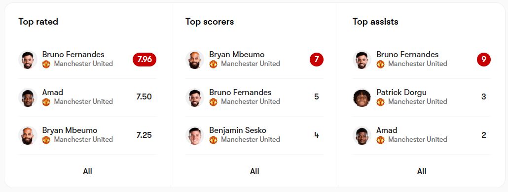 Ako môžete vidieť nižšie, na webovej stránke FotMob s futbalovými štatistikami je Fernandes v tejto sezóne najlepšie hodnoteným hráčom United, pričom je ich druhým najlepším strelcom a s určitým náskokom je na vrchole ich rebríčka asistencií…