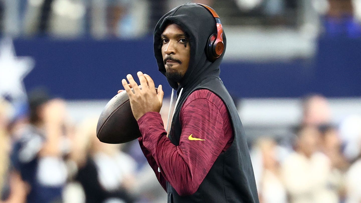 Rozohrávač Washington Commanders Jayden Daniels (5) sa 19. októbra 2025 zahrieva pred videohrou proti Dallas Cowboys v AT&T Arene. (Kevin Jairaj/Imagn Images)