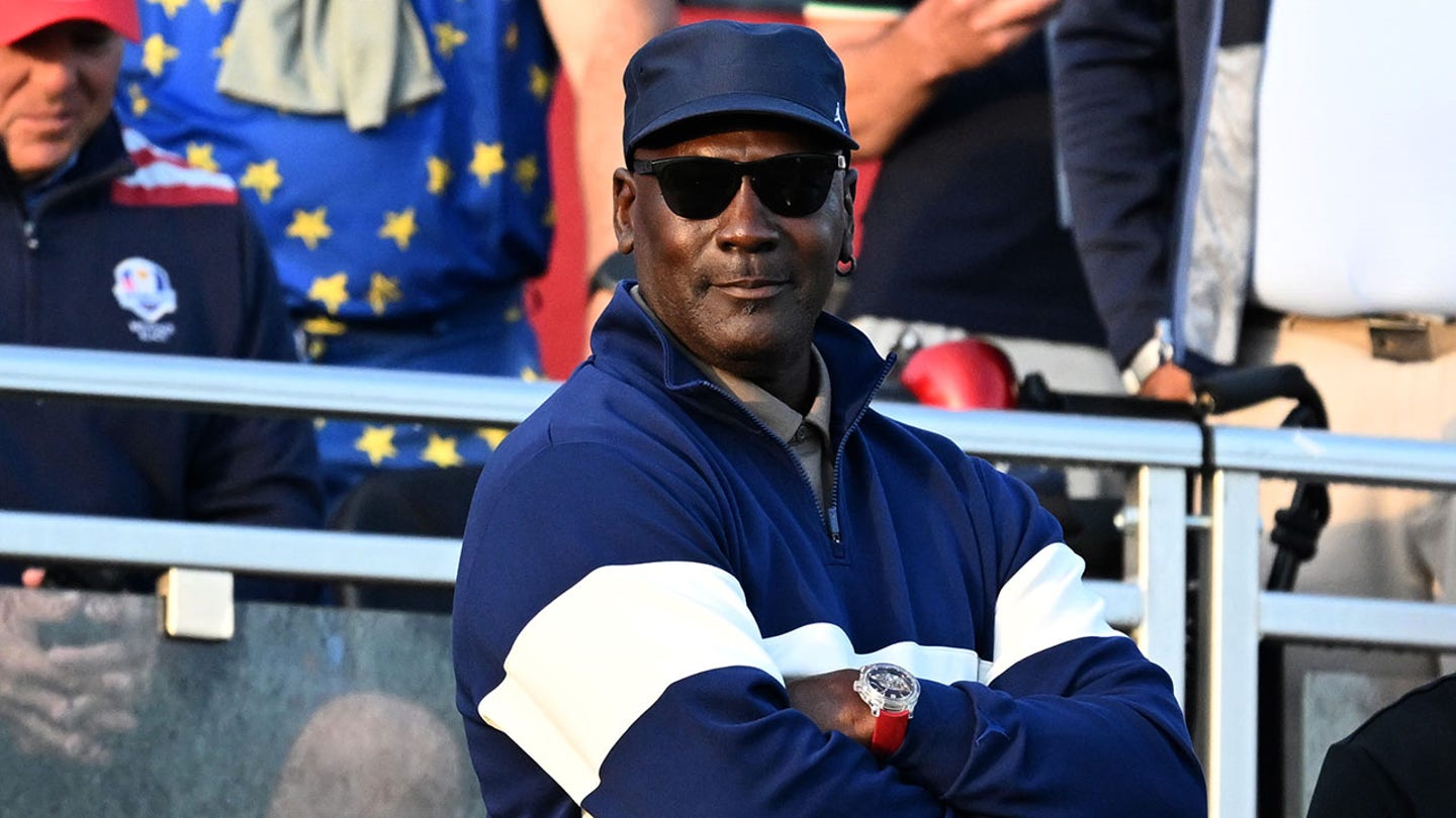 Michael Jordan sleduje úvodné otvorenie v predposledný deň súťažiacich o Ryder Mug na Bethpage Black 27. septembra 2025. (Dennis Schneidler/Imagn Photos)