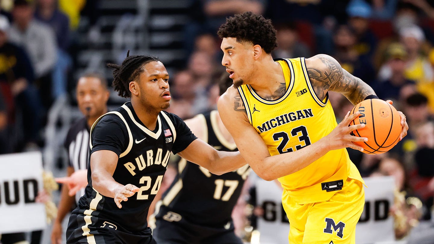 Útočník Michigan Wolverines Yaxel Lendeborg (23) vyzerá, že prihrá ako strážca Purdue Boilermakers Gicarri Harris (24) počas prvého polčasu počas mužského turnaja Big Ten Conference Tournament Championship v United Center 15. marca 2026. (Kamil Krzaczynski/Imagn Images)