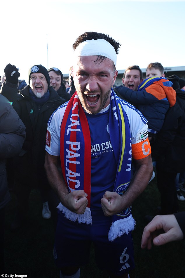 Kapitán Macclesfieldu Paul Dawson oslavuje víťazstvo Macclesfieldu proti Crystal Palace v najväčšom nešťastí v histórii FA Cupu