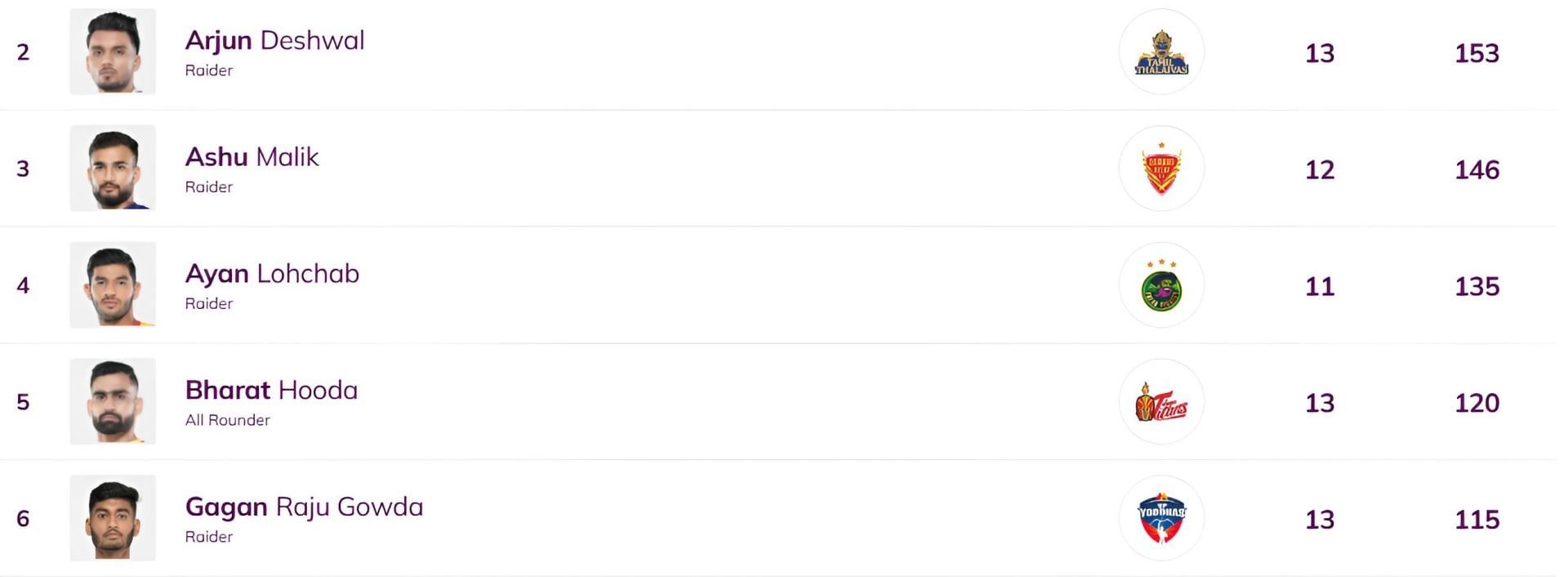 Z tohto dôvodu Jaideep Dahiya zostúpil z 2. na 3. prostredie. Kapitán Haryana Steelers má 42 faktorov. Gaurav Khatri Puneri Paltan zostal na 4. mieste s 39 faktormi. Up Yoddhasov kapitán Sumit Sangwan zostal na 5. mieste s 38 faktormi.