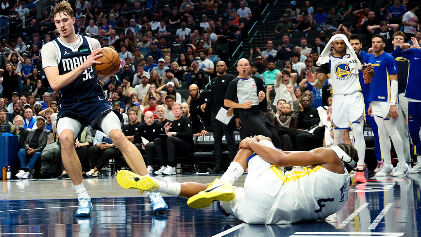 Strážca Golden State Warriors Moses Moody (4) si zranil nohu pri pokuse skórovať pred útočníkom Dallas Mavericks Cooperom Flaggom (32) počas predĺženia v American Airlines Center 23. marca 2026. (Kevin Jairaj/Imagn Images)