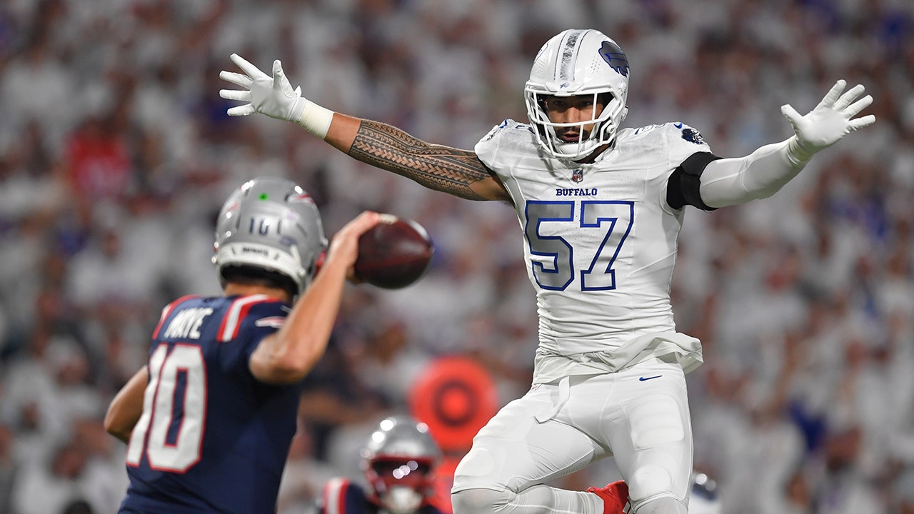 Buffalo stojí ochranný koniec AJ Epenesa (57) Zdôraznenie Nového Anglicka Patriots quarterback Drake Maye (10) Počas počiatočných päťdesiatich percent futbalovej videohry NFL, nedeľa 5. septembra 2025, v Orchard Parku, New York City. (AP Photo/Adrian Kraus)
