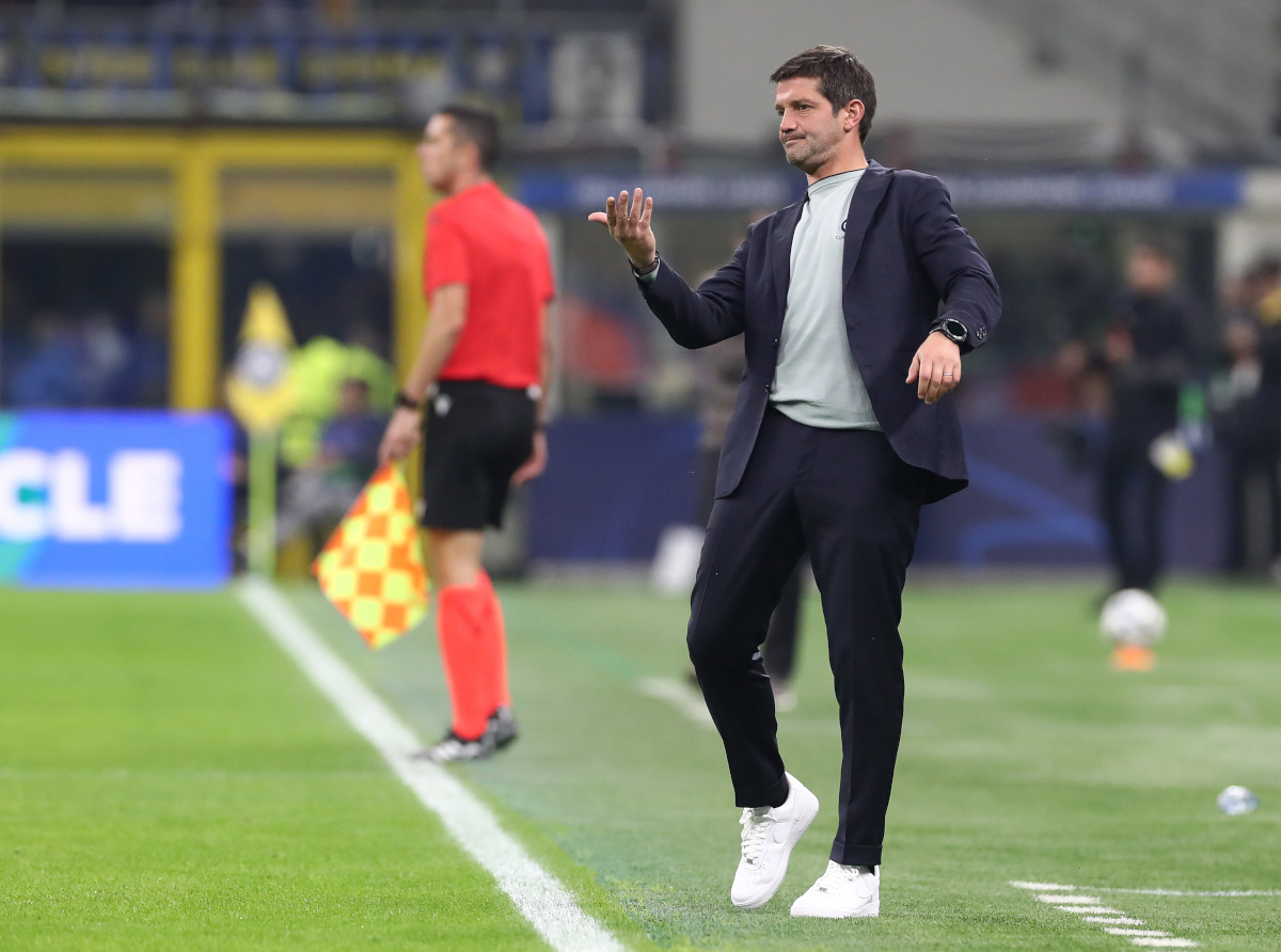 MILÁNO, TALIANSKO – 5. NOVEMBRA: Cristian Chivu, hlavný tréner Internazionale, dáva pokyny tímu počas fázy MD4 zápasu Ligy majstrov UEFA 2025/26 medzi FC Internazionale Milano a FC Kairat Almaty na Stadio San Siro 5. novembra 2025 v Miláne v Taliansku. (Foto: Marco Luzzani/Getty Images)