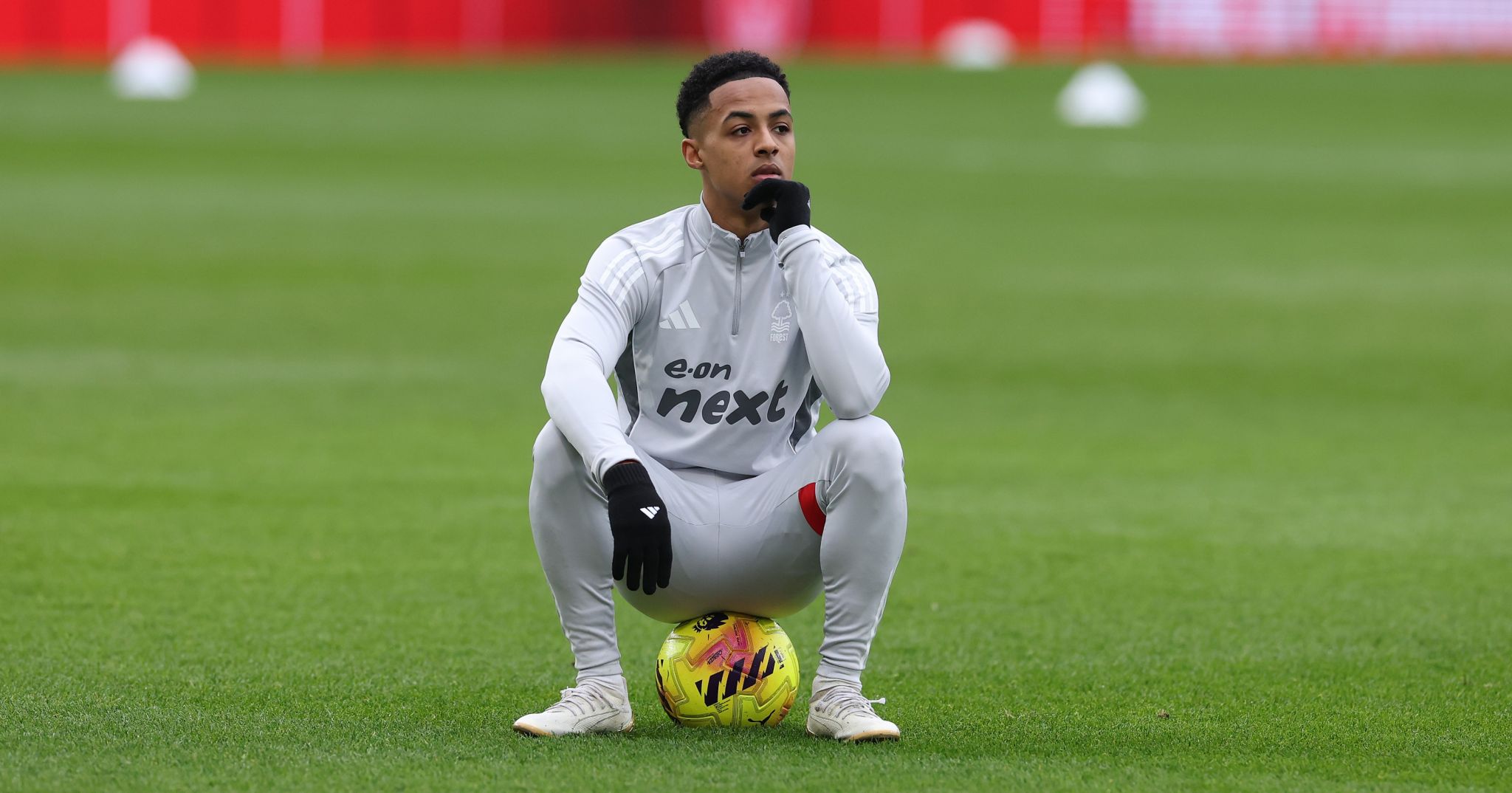 Omari Hutchinson z Nottingham Forest sa počas zahrievania pozerá. (Foto: David Rogers/Getty Images)