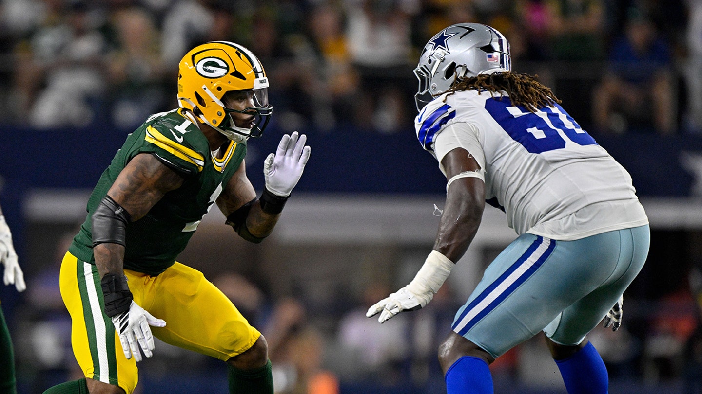 Ofenzívny zákrok Dallas Cowboys Tyler Guyton (60) sa vracia, aby zablokoval obrannú koncovku Green Bay Packers Micaha Parsonsa (1) počas zápasu medzi Dallas Cowboys a Green Bay Packers na štadióne AT&T v Arlingtone v Texase 28. septembra 2025. (Jerome Miron/Imagn Images)