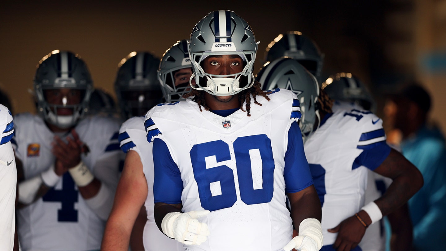 Ofenzívny zákrok Dallas Cowboys Tyler Guyton (60) sa pripravuje na ihrisko pred zápasom proti Carolina Panthers na Bank of America Stadium v Charlotte v Severnej Karolíne 12. októbra 2025. (Cory Knowlton/Imagn Images)