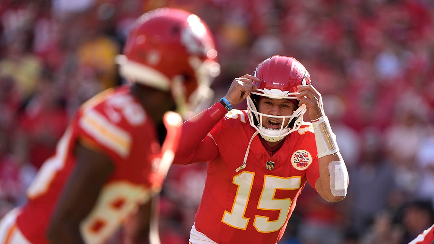 Kansas City Chiefs quarterback Patrick Mahomes vyzýva na línii potýčky počas počiatočných päťdesiat percent futbalovej videohry NFL futbalu v porovnaní s Baltimore Ravens nedeľou 28. septembra 2025 v Kansas City, Missouri. (AP Photo/Charlie Riedel)