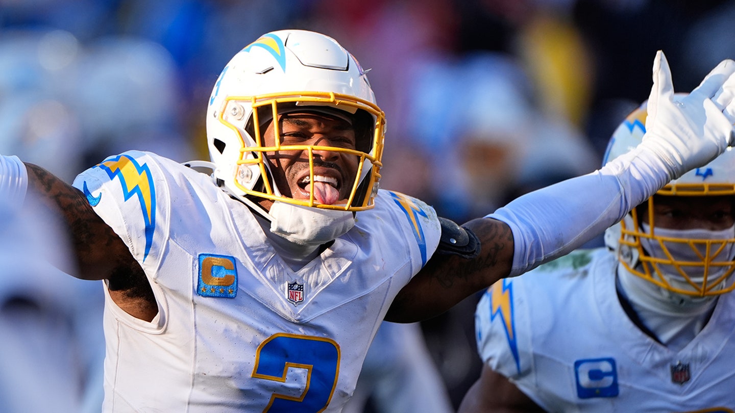 Bezpečnosť Los Angeles Chargers Derwin James Jr. (3) oslavuje po zachytení prihrávky počas druhého polčasu futbalového zápasu NFL proti Kansas City Chiefs v nedeľu 14. decembra 2025 v Kansas City, Misouri. (AP Photo/Charlie Riedel)