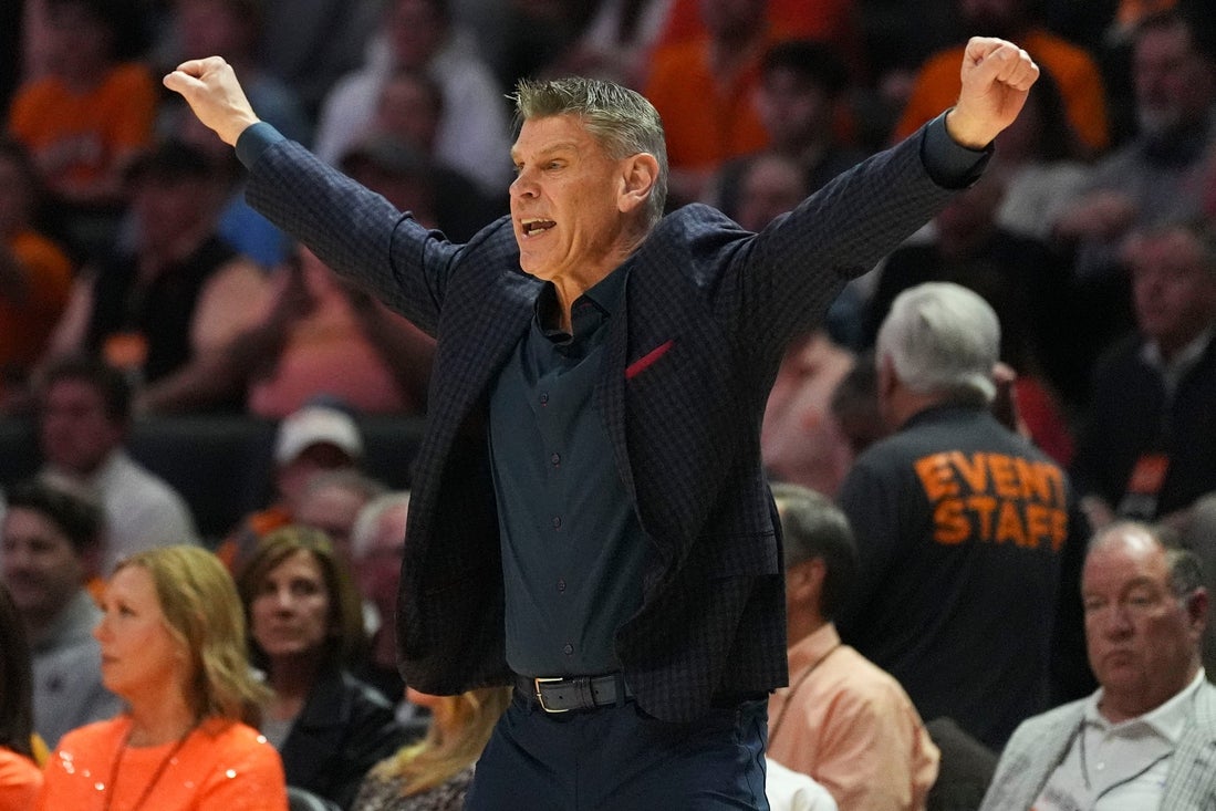 Basketbalový tréner Oklahomy Porter Moser počas vysokoškolského basketbalového zápasu NCAA proti Tennessee 18. februára 2026 v Knoxville, Tennessee.