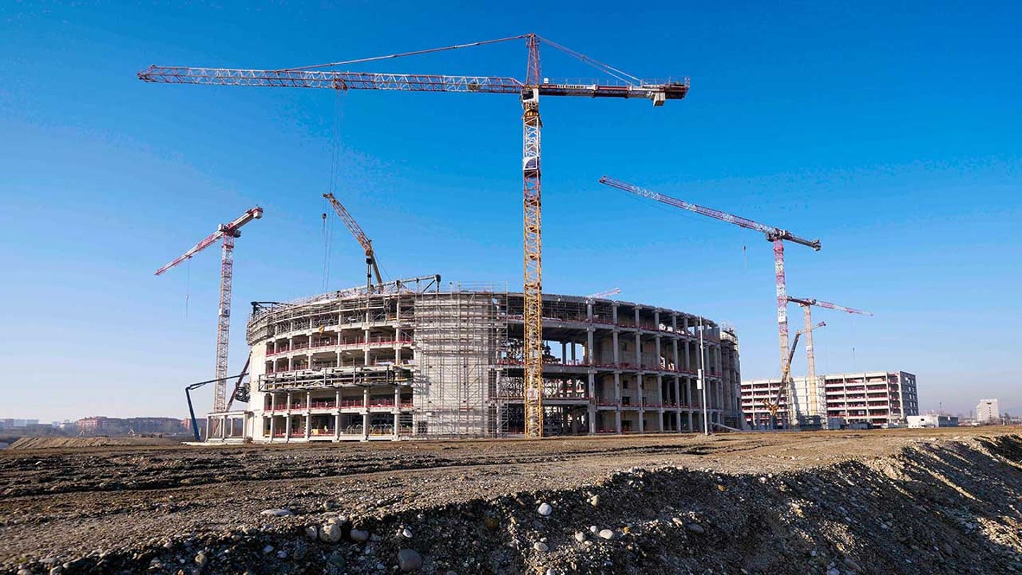 Výstavba pokračuje v hokejovej aréne Milano Santagiulia pre zimné olympijské hry v Miláne Cortina 2026, ktoré sa budú konať 15. januára 2025 v talianskom Miláne. (AP Photo/Luca Bruno, súbor)