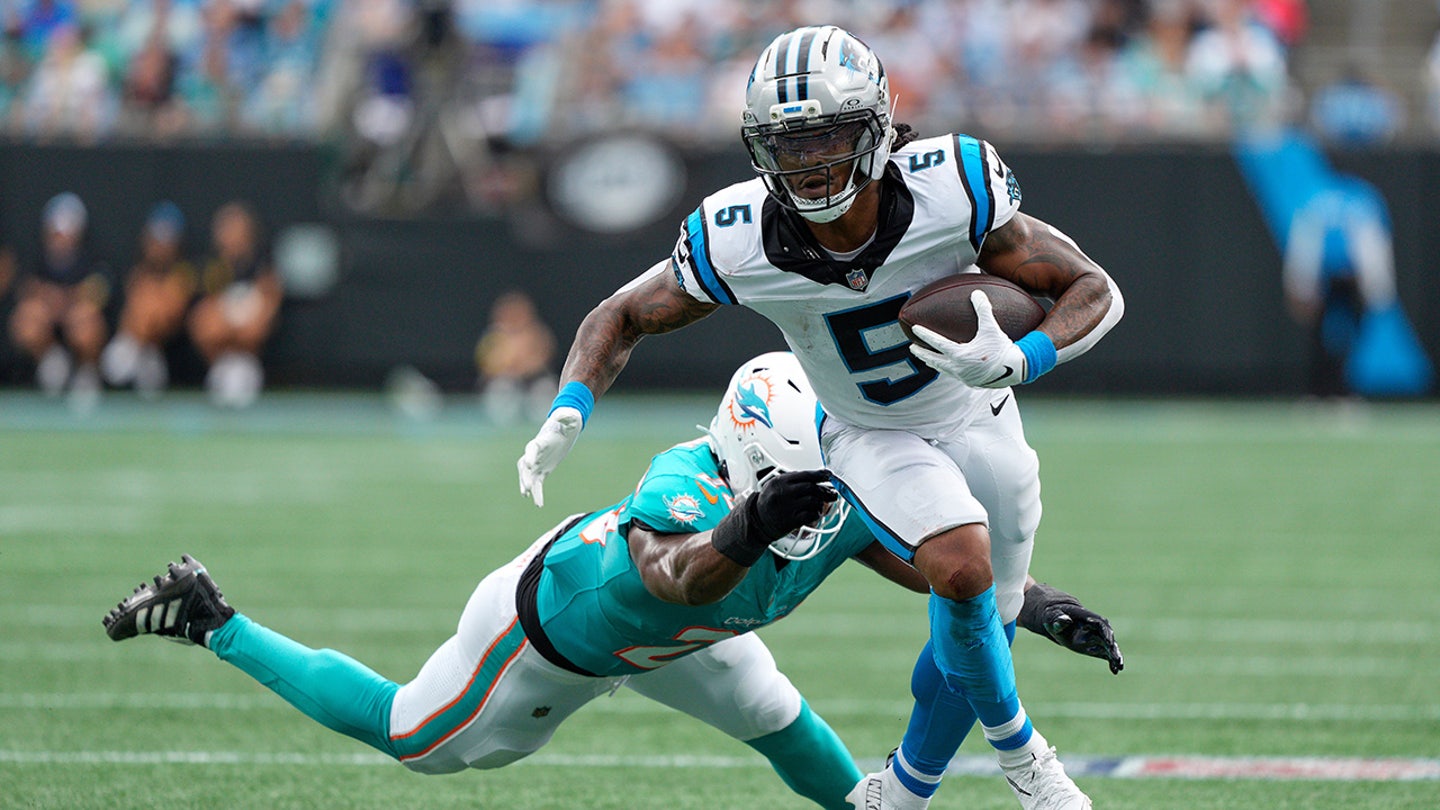 Carolina Panthers, ktorá beží späť Rico Dowdle, si pamätá po tom, čo sa zhromaždila v porovnaní s Miami Dolphins počas 2. päťdesiat percent futbalovej videohry NFL, nedeľa, 5. októbra 2025, v Charlotte v Severnej Karolíne. (AP Photo/Jacob Kupferman)