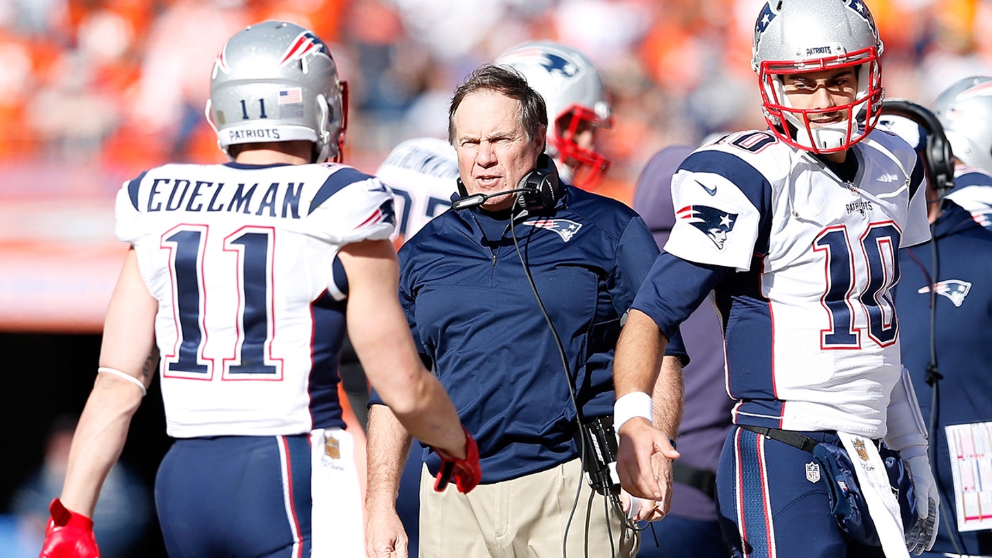 Hlavný tréner Bill Belichick z New England Patriots sa rozpráva s Julianom Edelmanom #11 v prvom polčase proti Denver Broncos v zápase AFC Championship na Sports Authority Field na Mile High 24. januára 2016 v Denveri, Colorado. (Christian Petersen/Getty Images)