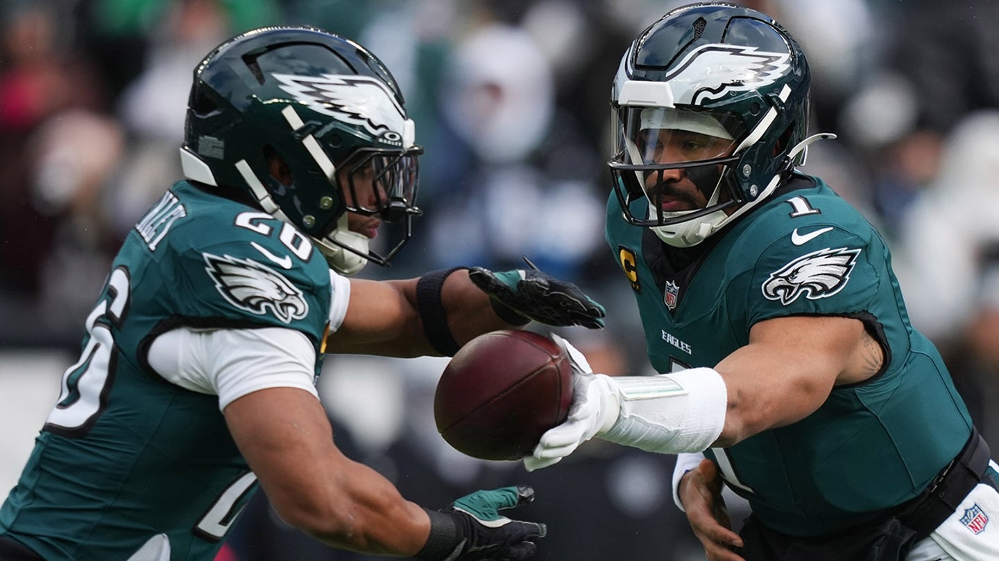 Rozohrávač Philadelphia Eagles Jalen Hurts (1) odovzdá loptu behu Philadelphia Eagles vľavo Saquonovi Barkleymu počas prvého polčasu futbalového zápasu NFL proti Las Vegas Raiders v nedeľu 14. decembra 2025 vo Philadelphii. (AP Photo/Matt Slocum)