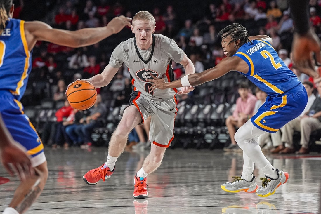 9. novembra 2025; Atény, Georgia, USA; Strážca Georgia Bulldogs Blue Cain (0) dribluje okolo strážcu Morehead State Eagles Daviona Cunninghama (2) počas prvého polčasu v Stegeman Coliseum. Povinný kredit: Dale Zanine-Imagn Images