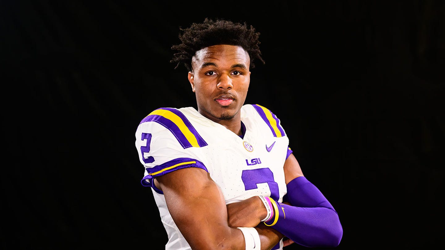 Kyren Lacy of the LSU Tigers predstavuje obrázok počas médií, ktorý sa konal v LSU Indoor Technique Center 17. júna 2024 v Baton Rouge v Louisiane. (Atletika LSU/univerzity pomocou getty obrázkov)