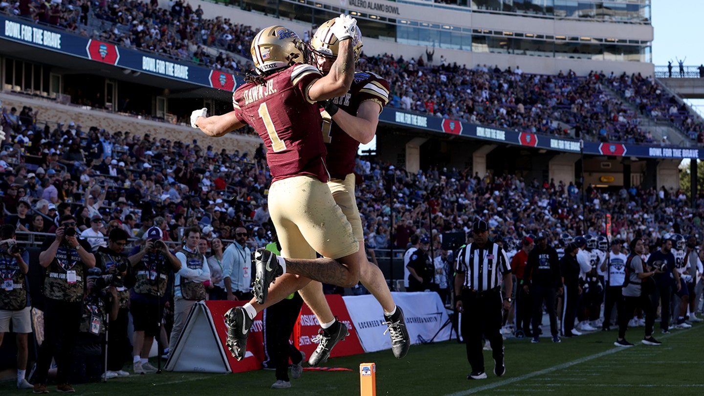 Chris Dawn Jr. (1) a Beau Sparks (11) z Texas State Bobcats oslavujú po zápase proti Rice Owls počas druhej polovice zápasu ozbrojených síl na štadióne Amon G. Carter 2. januára 2026 vo Fort Worth v Texase. (Tim Heitman/Getty Images)
