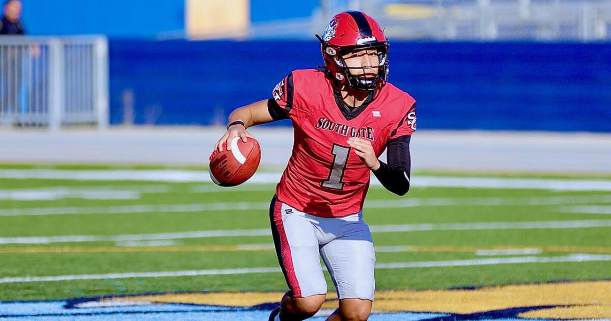Víťazná touchdownová prihrávka od QB Michaela Gonzaleza na WR Nicholasa Fonsecu, ktorá zabezpečila South Gate titul City Division I. S láskavým dovolením Intescholastic Films. Opravené. pic.twitter.com/78ufWEdINW