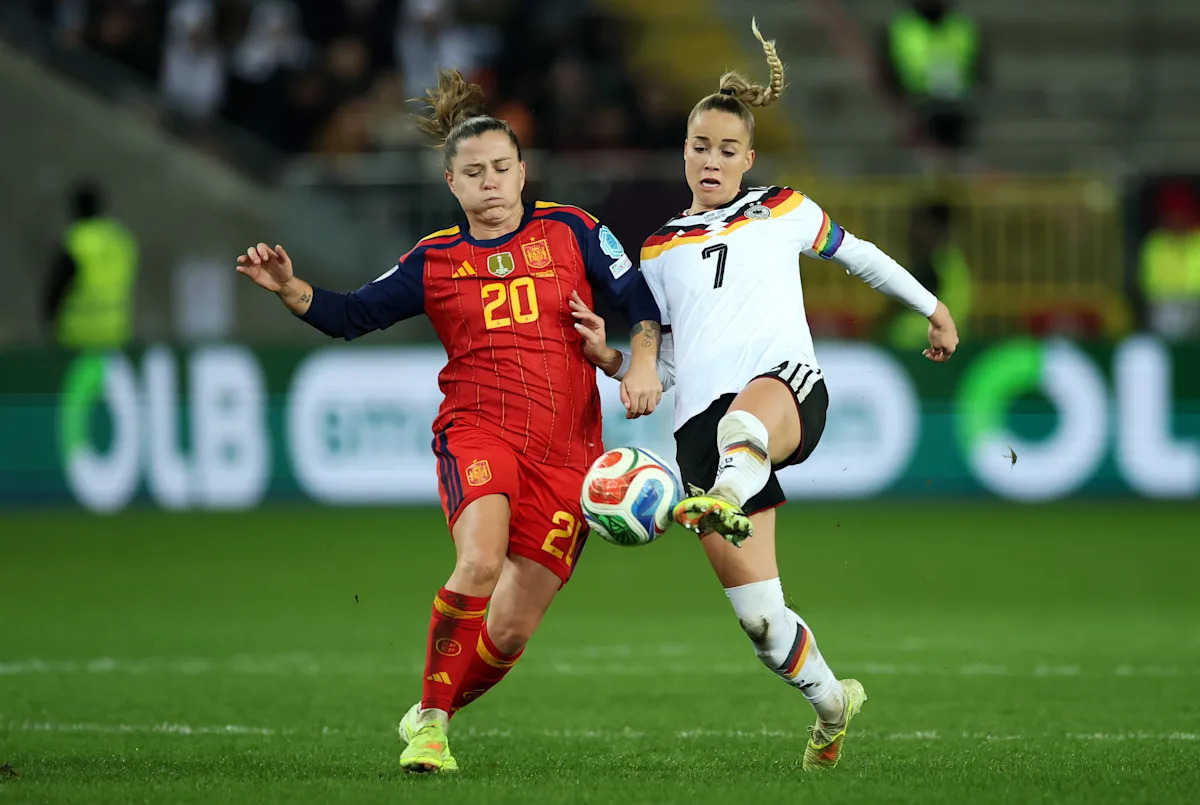 Nemecko po tom, čo odolalo nátlakovej fáze, našlo cestu späť do hry. Najväčšiu šancu zápasu mala v 71. minúte najvýraznejšia nemecká hráčka Klara Bühl, ale aj ona trafila iba žrď. Zápas sa tak skončil bezgólovou remízou. Všetko je ešte otvorené pre druhý zápas finále v Madride, ktorý sa uskutoční budúci utorok o 18:30.