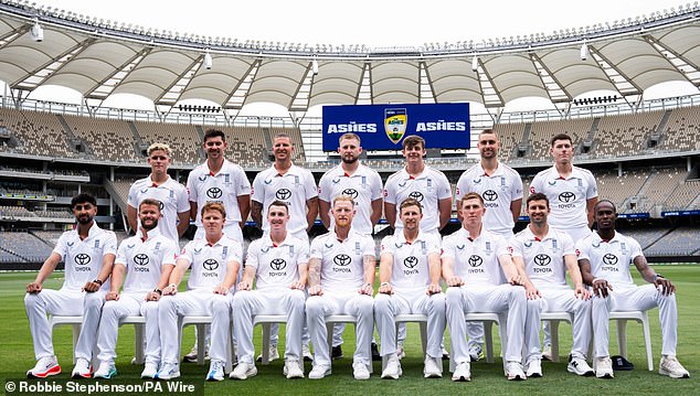 Shoaib Bashir (vľavo dole) má v tíme dostatočnú senioritu na to, aby vytvoril prvý rad na oficiálnej fotografii Anglicka Ashes na Optus Stadium.