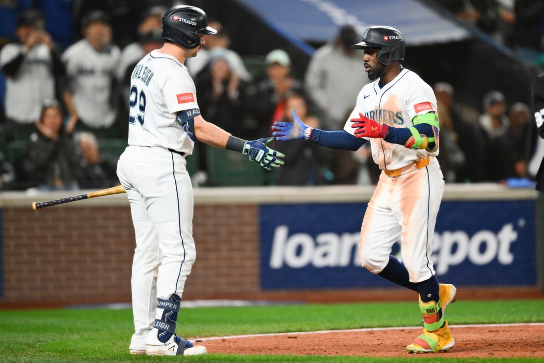 15. októbra 2025; Seattle, Washington, USA; Ľavý hráč v poli Seattle Mariners Randy Arozarena (56) oslavuje s chytačom Seattle Mariners Calom Raleighom (29) po tom, čo počas ôsmej zmeny proti Torontu Blue Jays počas tretieho zápasu kola ALCS play-off 2025 MLB v T-Mobile Parku zasiahol samostatný homerun. Povinný kredit: Steven Bisig-Imagn Images