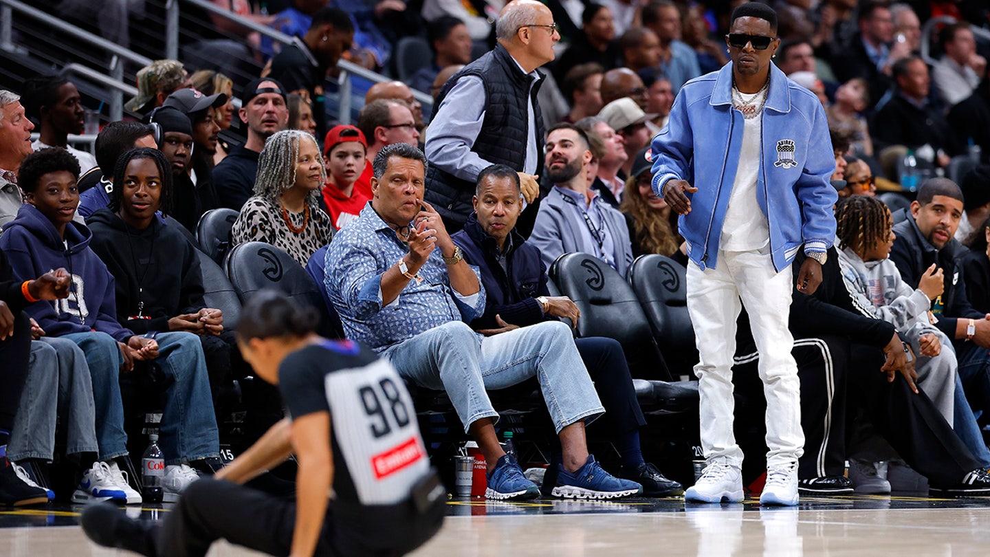 Rapper a zabávač Boosie Badazz reaguje po tom, čo videl rozhodcu Sha’Rae Mitchell (98) padať na zem po kolízii počas štvrtého štvrťroka zápasu basketbalovej NBA medzi Brooklyn Nets a Atlanta Hawks v State Farm Arena v Atlante v štáte Georgia 12. marca 2026. (Todd Kirkland/Getty Images)