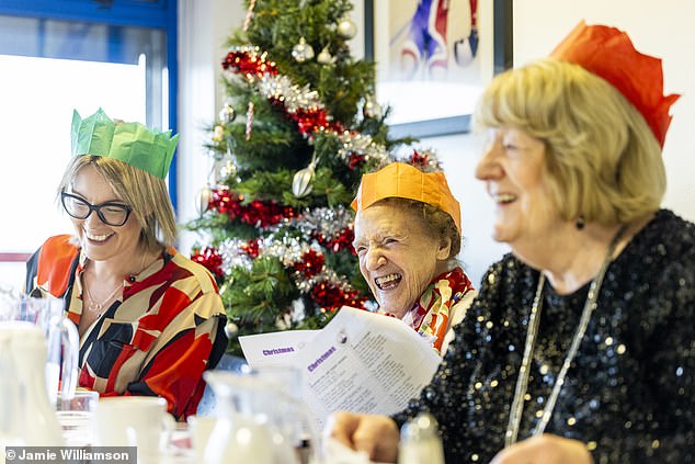 je to tak. Je obklopená dôchodcami, niektorí zo skupiny Parkinsonovcov, ktorí hrajú futbal vo Forthbanku, a iní, ktorí boli pozvaní na trojchodové jedlo, strhujúce spievanie kolied a návštevu Santa Clausa.