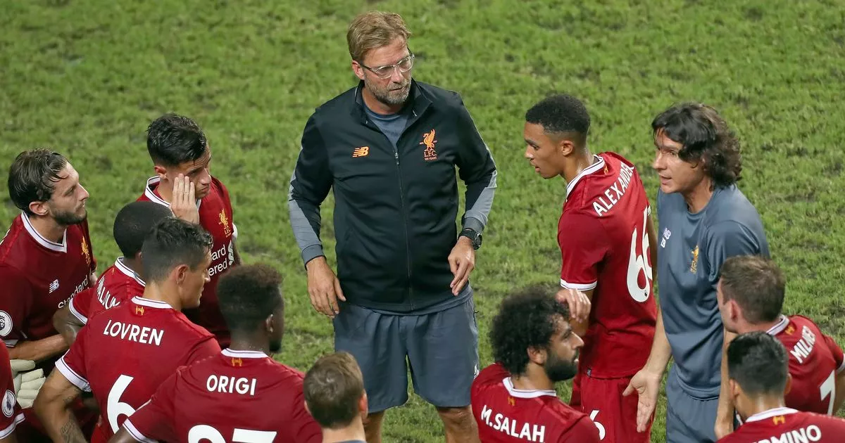 Jurgen Klopp Manažér Liverpoolu hovorí so svojimi hráčmi počas zápasu Premier League Asia Trophy medzi Liverpool FC a Leicester City FC na Hong Kong Stadium 22. júla 2017 v Hong Kongu, Hong Kong.