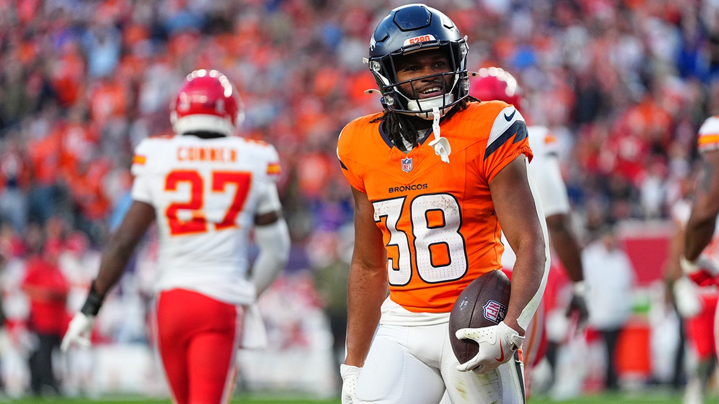 Bežecký obranca Denver Broncos Jaleel McLaughlin oslavuje po strelení gólu počas druhého polčasu futbalového zápasu NFL proti Kansas City Chiefs v nedeľu 16. novembra 2025 v Denveri. (AP Photo/Jack Dempsey)