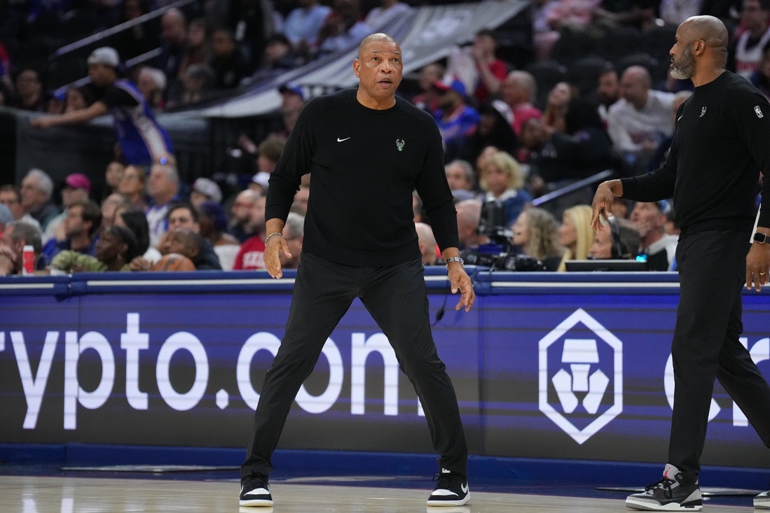 12. apríla 2026; Philadelphia, Pensylvánia, USA; Hlavný tréner Milwaukee Bucks Doc Rivers reaguje proti Philadelphii 76ers v druhej štvrtine v Xfinity Mobile Arene. Povinný kredit: Kyle Ross-Imagn Images
