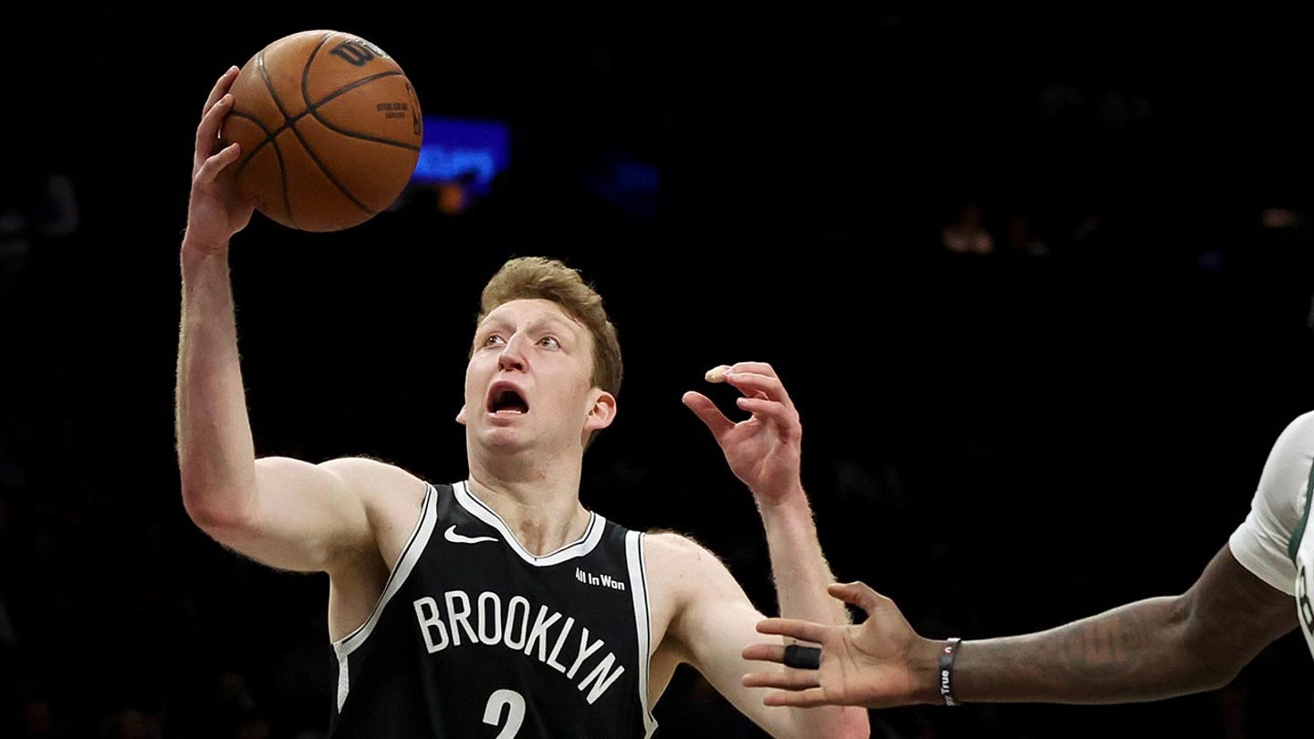 Útočník Brooklyn Nets Danny Wolf (2) prechádza ku košu okolo útočníka Milwaukee Bucks Bobbyho Portisa (9) počas prvého polčasu zápasu basketbalovej NBA v New Yorku 14. decembra 2025. (Foto Heather Khalifa/AP)