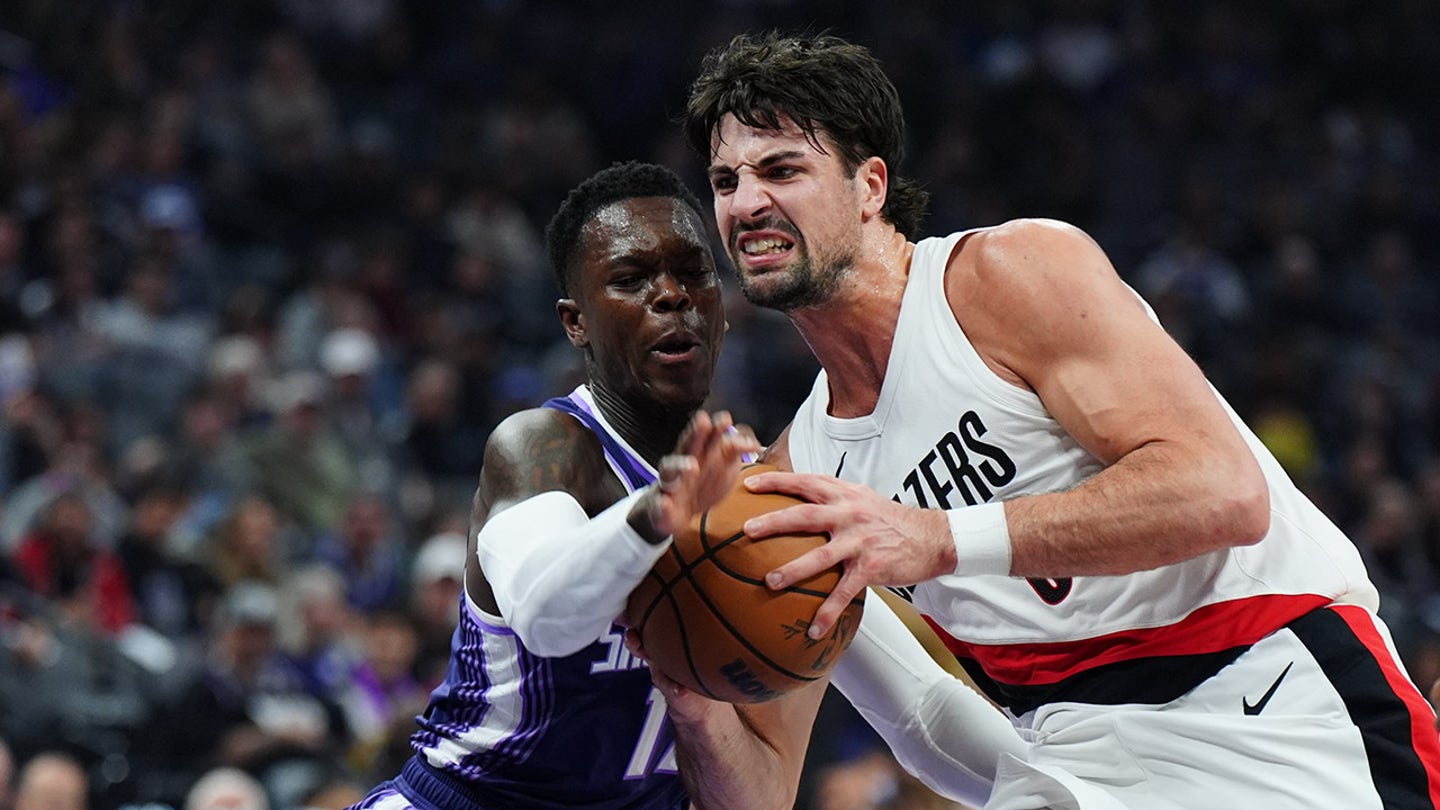 Útočník Portland Trail Blazers Deni Avdija (8) sa pokúša prejsť okolo strážcu Sacramenta Kings Dennisa Schrodera (17) počas prvého polčasu zápasu basketbalovej NBA v sobotu 20. decembra 2025 v Sacramente v Kalifornii. (AP Photo/Alan Greth)