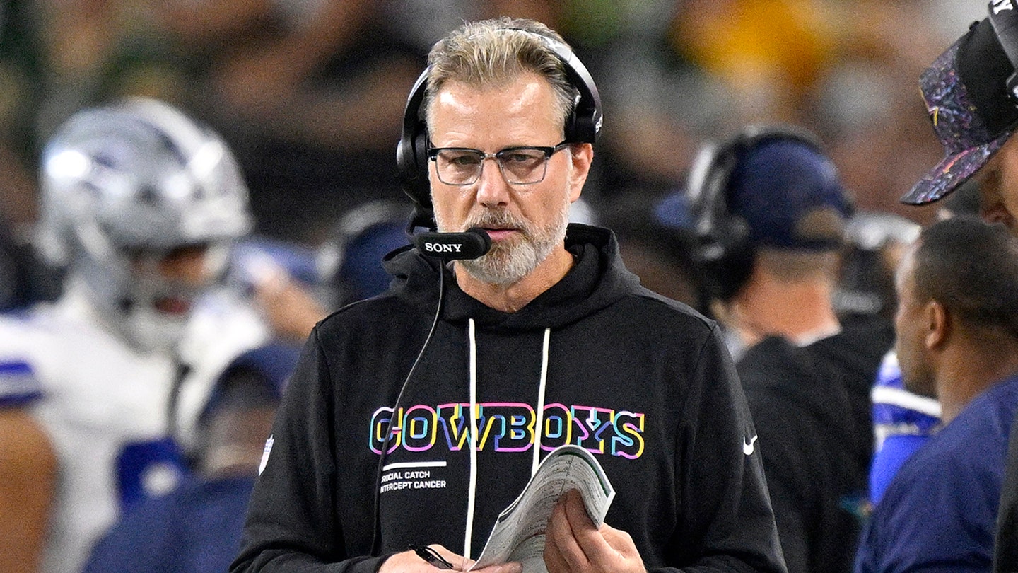 Defenzívny koordinátor Dallasu Cowboys Matt Eberflus nastúpi v prvom polčase proti Green Bay Packers na AT&T Stadium. Fotografia bola urobená v Arlingtone, Texas, 28. septembra 2025. (Jerome Miron/Imagn Images)