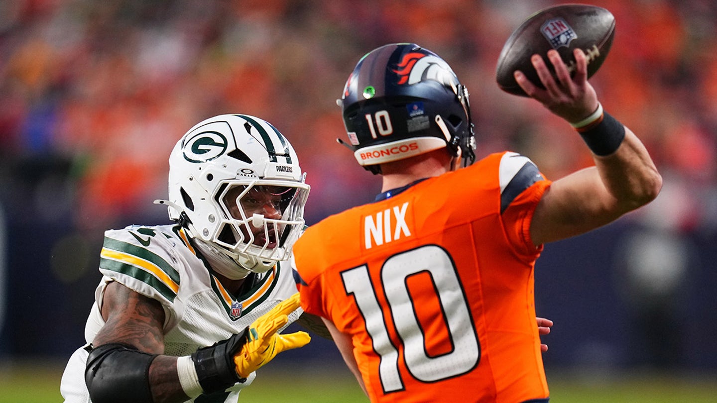 Micah Parsons z Green Bay Packers vyvíja tlak na Boa Nixa z Denver Broncos počas druhého polčasu futbalového zápasu NFL v nedeľu 14. decembra 2025 v Denveri. (AP Photo/Jack Dempsey)